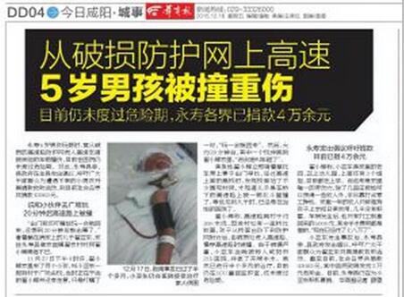 2015年11月27日下午,永寿5岁男孩玩耍时,竟从破损的高速路防护网进入高速车道被疾驰的车辆撞伤,目前仍在医院接受治疗。对此,永寿县委、县政府在全县发出倡议,呼吁广大干部群众为遭遇不幸的小男孩开展捐款救助活动,到目前社会各界共捐款43063元。但厄运,似乎并不打算放过这个饱受摧残的贫困家庭。